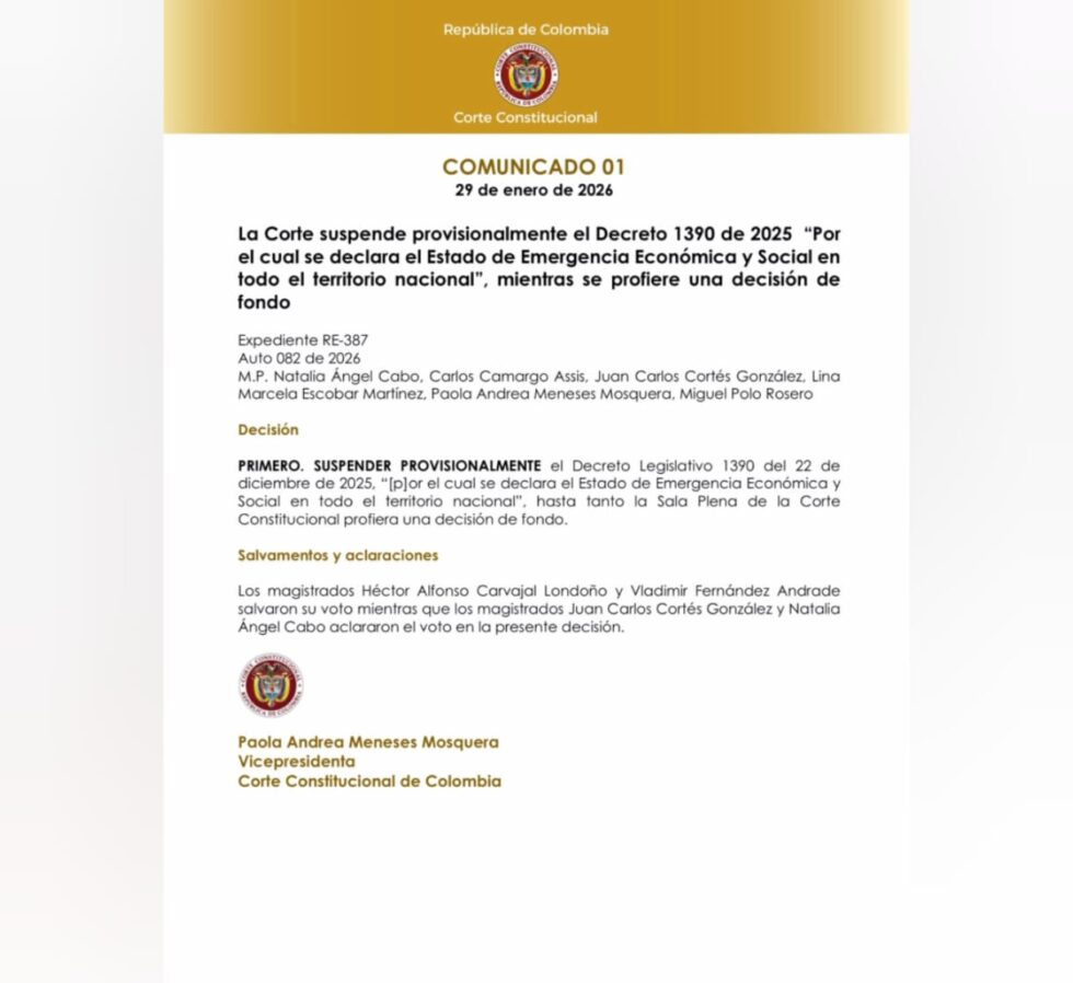 La Sala Plena suspendió de manera provisional el decreto que declaró el Estado de Emergencia Económica y Social en todo el territorio nacional, expedido el 22 de diciembre de 2025. Seis magistrados respaldaron la ponencia de Carlos Camargo, que ordenó frenar la norma hasta que la Corte adopte una decisión de fondo.