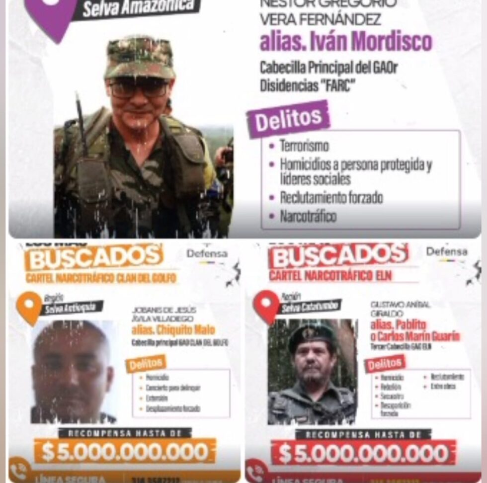 En ese marco, los tres principales blancos priorizados son ‘Chiquito Malo’, ‘Pablito’ e ‘Iván Mordisco’, que tienen órdenes de captura vigentes y recompensas de hasta 5.000 millones de pesos.