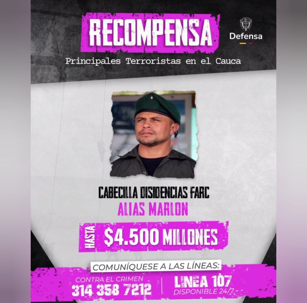 Desde Palmira, durante un consejo extraordinario de seguridad, el ministro de Defensa, Pedro Arnulfo Sánchez, anunció una de las recompensas más altas fijadas por el Estado colombiano para la captura de un cabecilla armado: $5.000 millones por información que conduzca a alias ‘Marlon’.